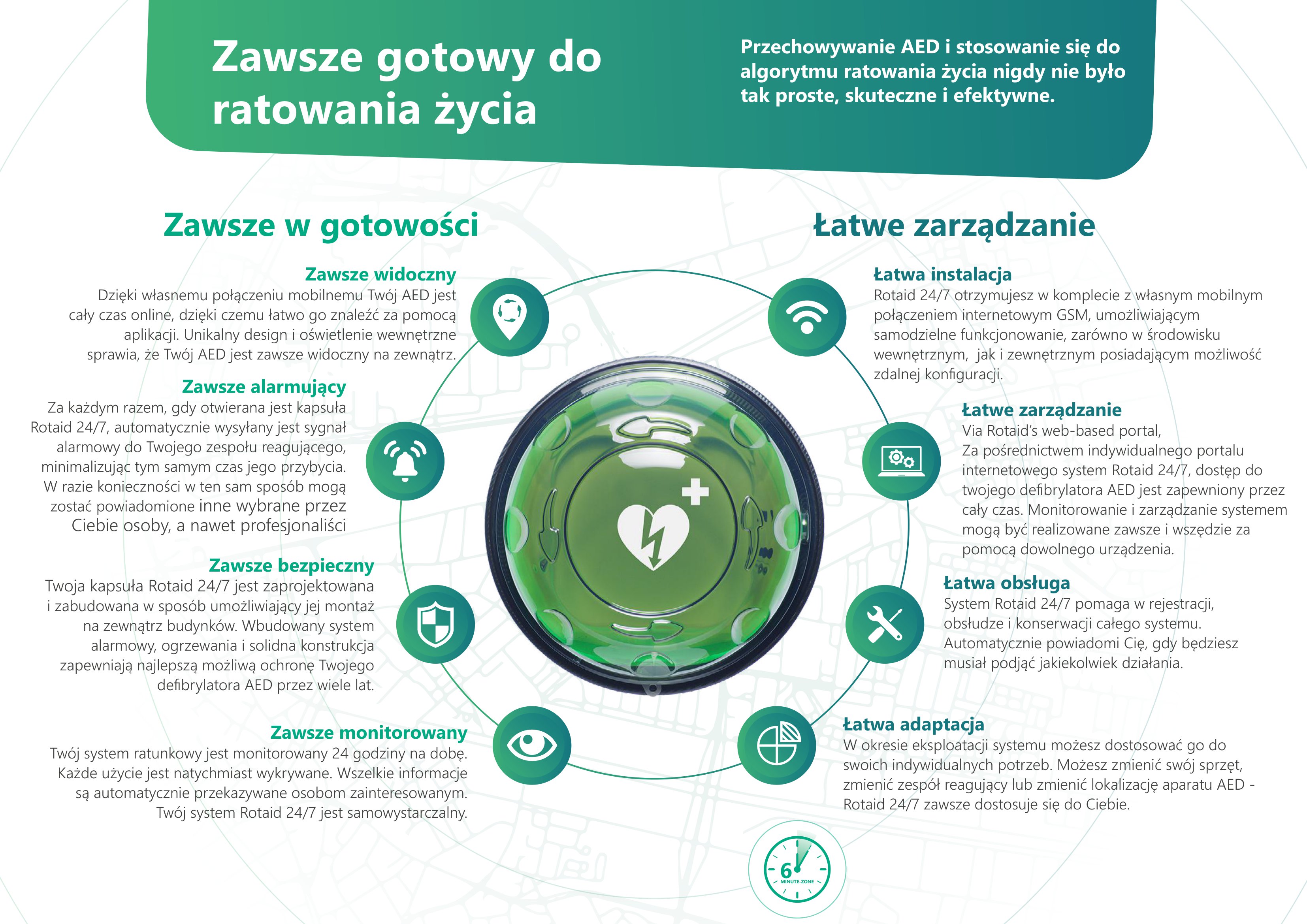 Kapsuła Rotaid Transparent Green z alarmem to solidne i nowoczesne rozwiązanie do przechowywania defibrylatora AED w przestrzeni zewnętrznej. Została zaprojektowana z myślą o pracy w wymagających warunkach atmosferycznych, zapewniając maksymalną ochronę urządzenia.