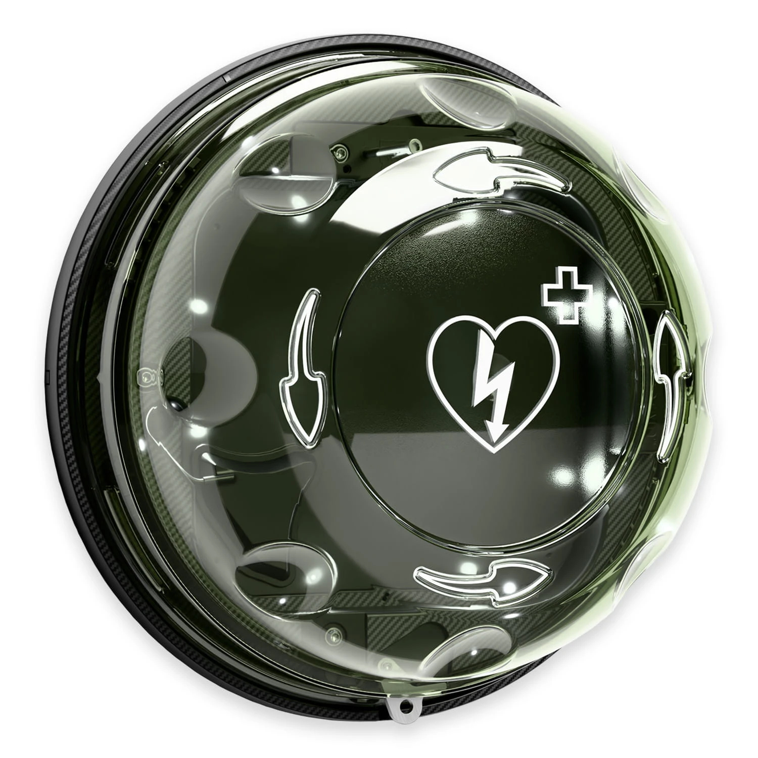 Dostęp do defibrylatora jest szybki i intuicyjny – wystarczy obrócić pokrywę zgodnie ze wskazanym kierunkiem. Konstrukcja pozbawiona zawiasów i uchwytów minimalizuje ryzyko awarii, zwiększając niezawodność w sytuacjach awaryjnych.